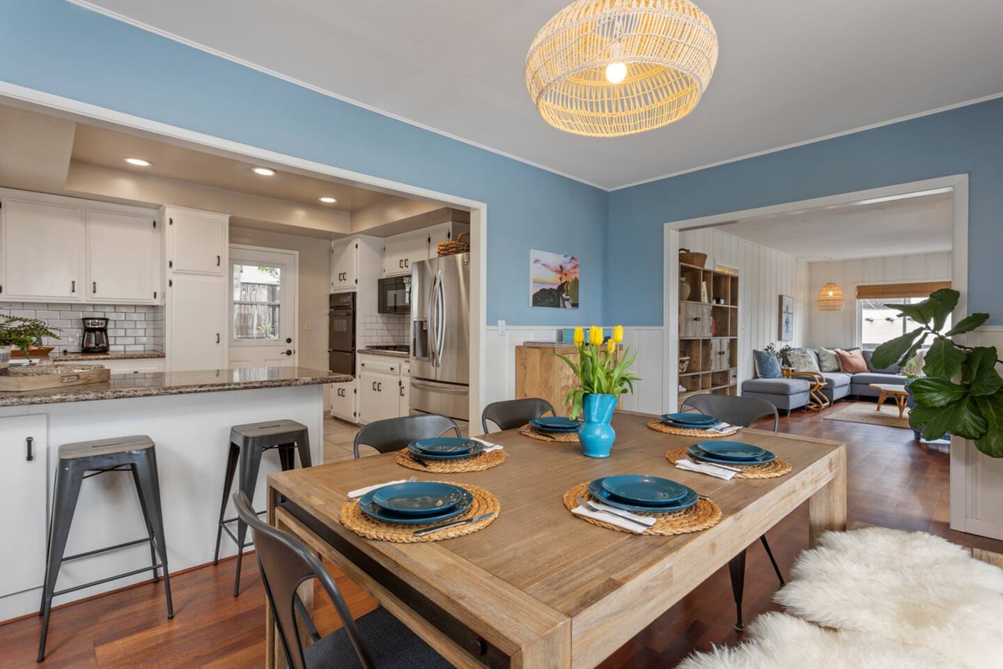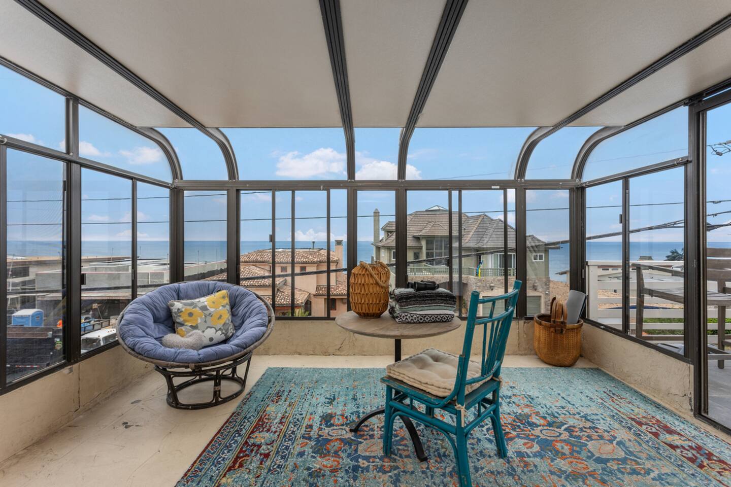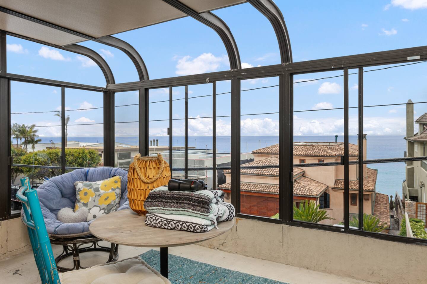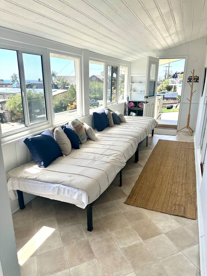 It makes us so happy to share this funky space. Originally a one bedroom beach bungalow, the home has had many additions over the years. With 3 bedrooms and a 4th bonus sleeping porch/sunroom, we can comfortably sleep 8. Each level has one full bath, and the downstairs back bedroom has an additional 1/2 bath. Most guests head straight up to the rooftop deck to enjoy a 360 degree view. A perfect spot to catch the sunset, check the waves, soak up some rays, or star gaze! The house offers many nooks with seating to read, work, or relax with a beverage while enjoying the view and sea breezes. San Diego's temperate weather allows us to take advantage of the fresh ocean air to cool us down on hot summer days, and we bundle up in sweatshirts and slippers to stay warm in cooler months. We do provide fans, air conditioner. space heaters, throws and heated blankets. The kitchen is fully stocked and the dining table expands to seat eight. The back patio has a dining table, gas bbq, table for dining and outdoor shower for rinsing off the salt and sand after a day at the beach! Park in the single car garage and one additional driveway space, or in front of the house where street parking is free. We offer 4 beach/camp chairs and 4 bikes for you to enjoy.