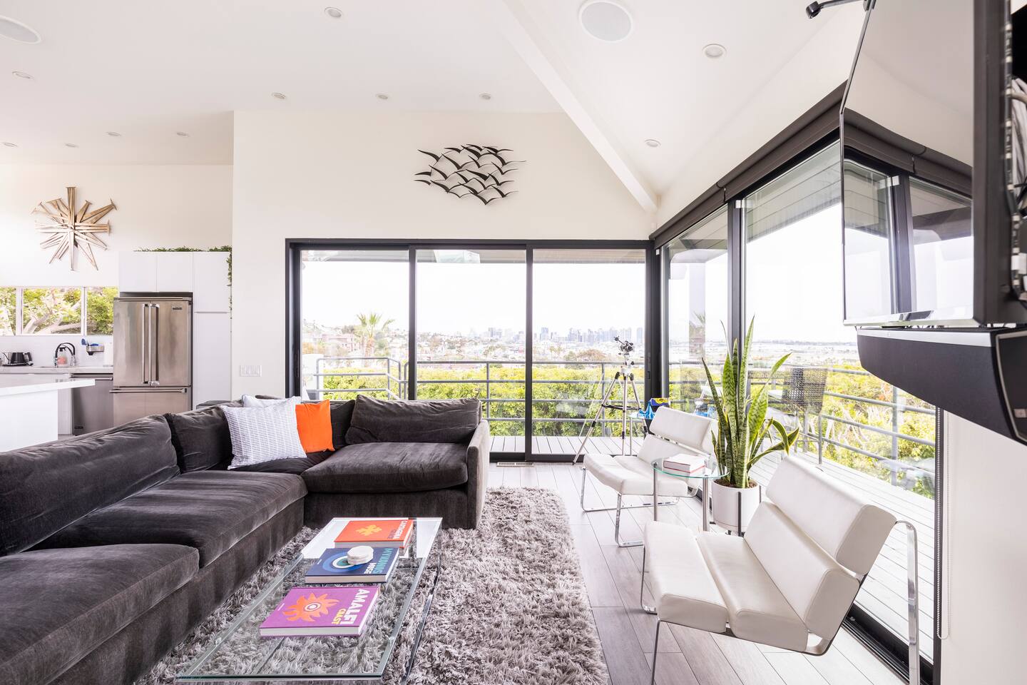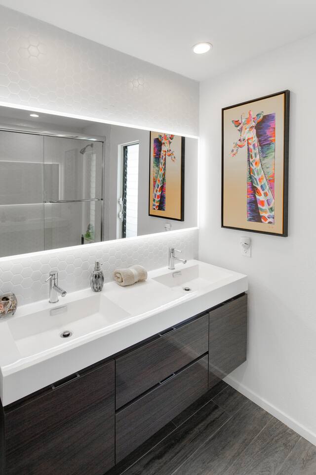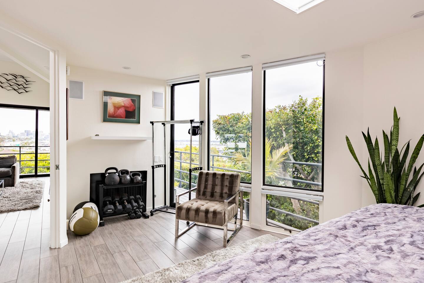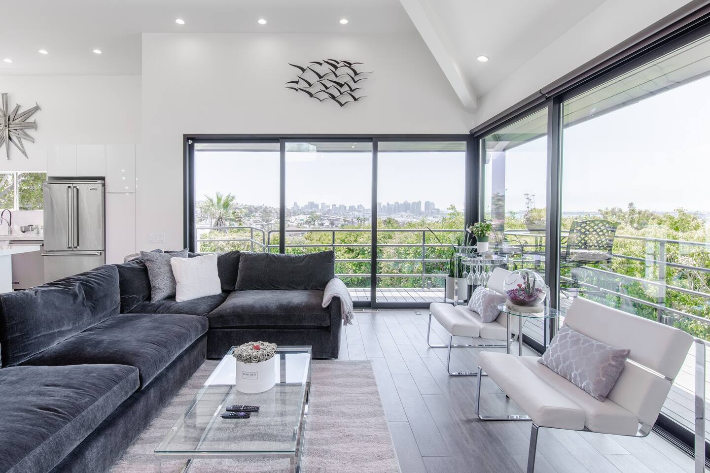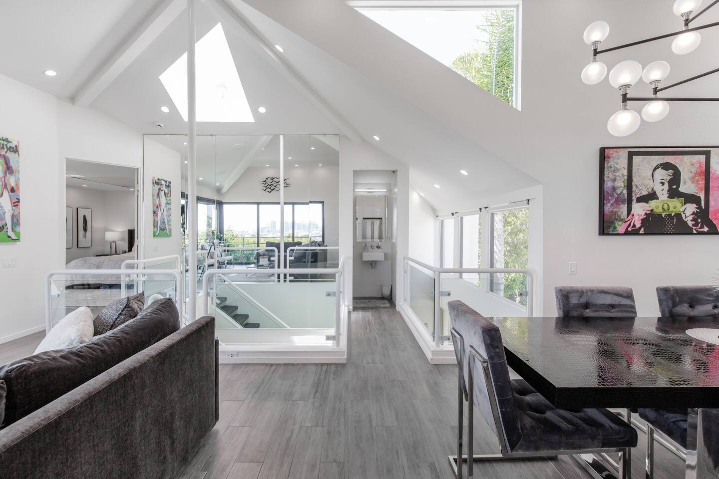 Sink into the alfresco couch by the sparkling pool at this tranquil urban oasis minutes from downtown. Floor-to-ceiling windows and La Cantina sliding doors fill the home with natural light and bay breezes, while gloss units and velvet add luxury. Configured for families and groups of friends/couples with the master bedroom is on the top floor, two bedrooms on the center floor, and the pool casita (with bed) is located outside by the pool and spa. Three of the four bedrooms have optional fold away bed that can be set up for you upon request. Guests are able to use the entire property except for the crawl space under house, garage, one locked kitchen cabinet, and the master bedroom closet. We have a professional AirBNB co-host who will be available as needed throughout your stay as we often travel when the house rents and live in it when not traveling. The property is perched above Old Town in the historic North Mission Hills with panoramic unobstructed views of the downtown skyline, San Diego Bay, and Point Loma. One of the bedrooms is separate from the rest of the house located downstairs by the pool; great for privacy.