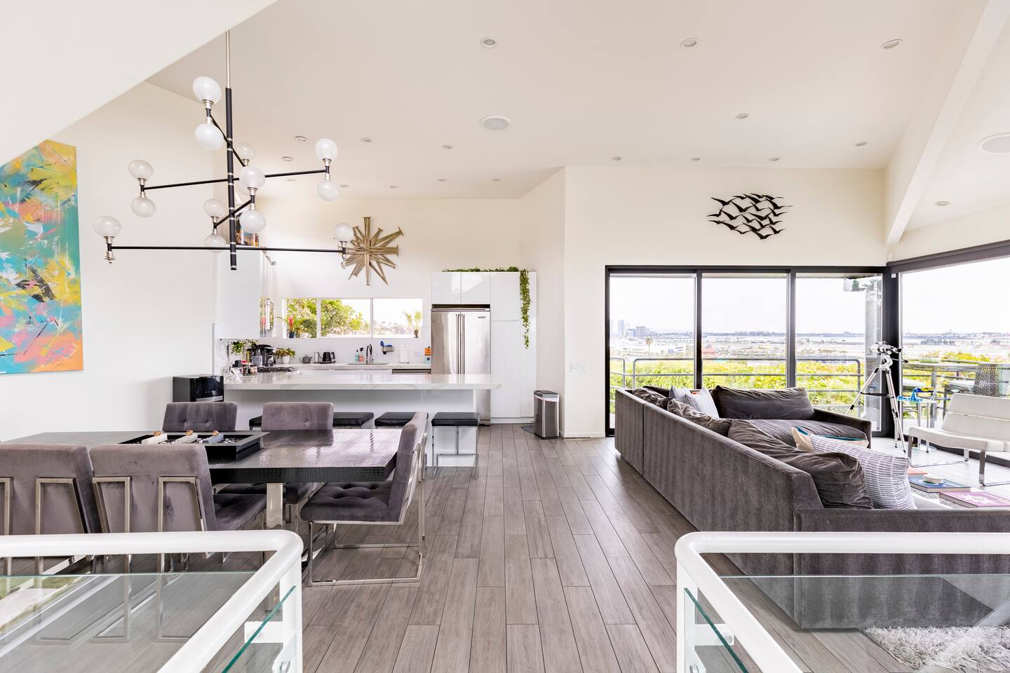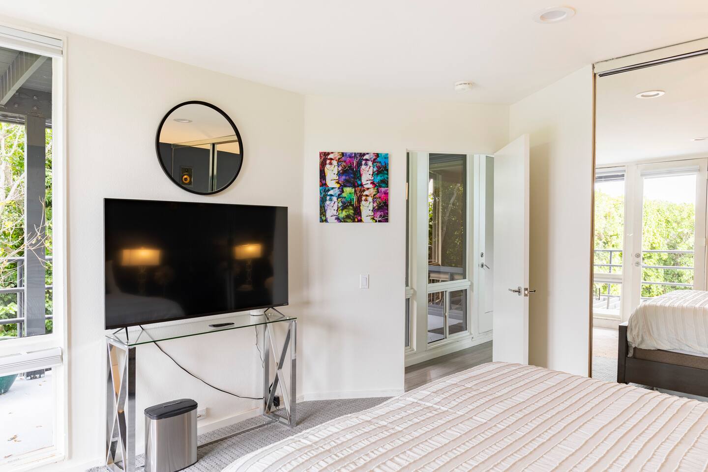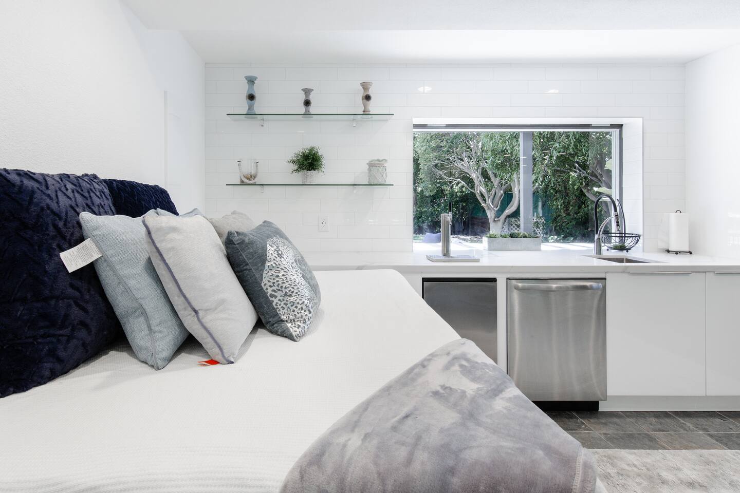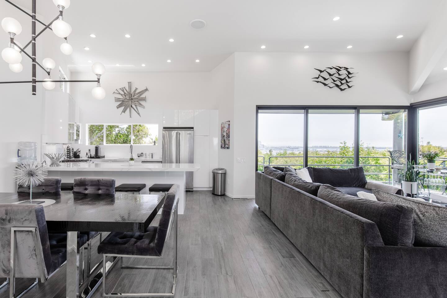 Sink into the alfresco couch by the sparkling pool at this tranquil urban oasis minutes from downtown. Floor-to-ceiling windows and La Cantina sliding doors fill the home with natural light and bay breezes, while gloss units and velvet add luxury. Configured for families and groups of friends/couples with the master bedroom is on the top floor, two bedrooms on the center floor, and the pool casita (with bed) is located outside by the pool and spa. Three of the four bedrooms have optional fold away bed that can be set up for you upon request. Guests are able to use the entire property except for the crawl space under house, garage, one locked kitchen cabinet, and the master bedroom closet. We have a professional AirBNB co-host who will be available as needed throughout your stay as we often travel when the house rents and live in it when not traveling. The property is perched above Old Town in the historic North Mission Hills with panoramic unobstructed views of the downtown skyline, San Diego Bay, and Point Loma. One of the bedrooms is separate from the rest of the house located downstairs by the pool; great for privacy.