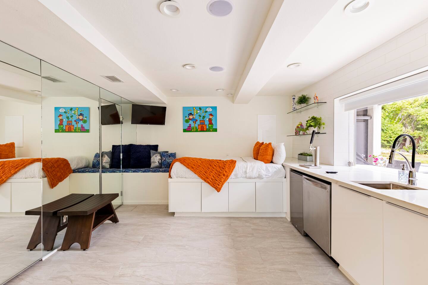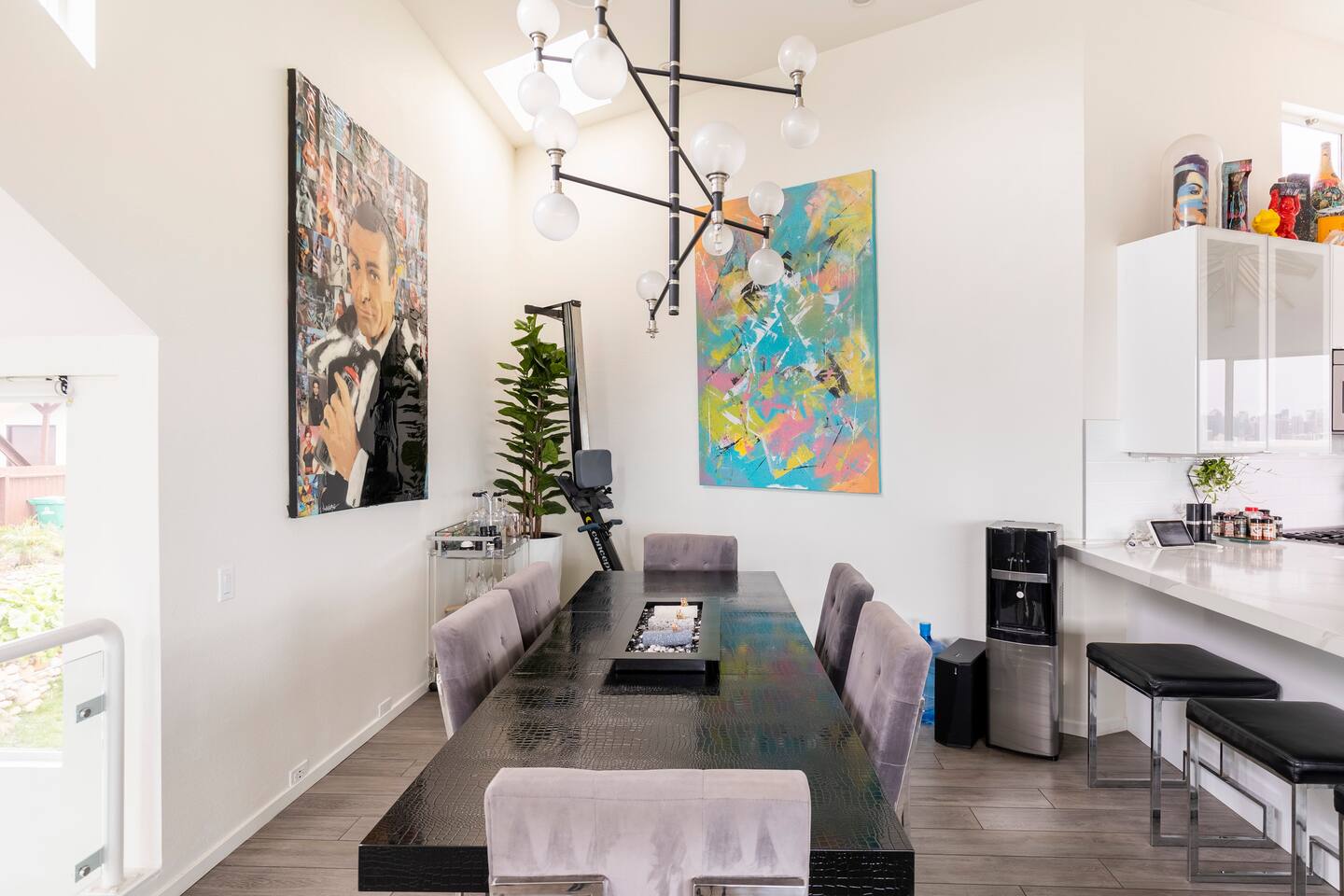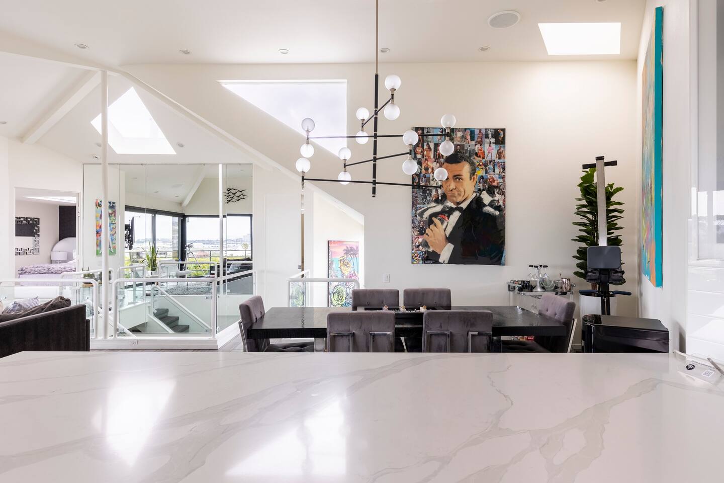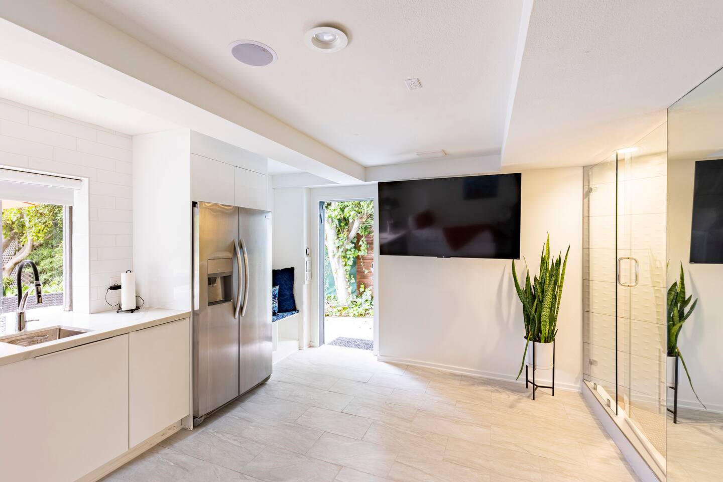 Sink into the alfresco couch by the sparkling pool at this tranquil urban oasis minutes from downtown. Floor-to-ceiling windows and La Cantina sliding doors fill the home with natural light and bay breezes, while gloss units and velvet add luxury. Configured for families and groups of friends/couples with the master bedroom is on the top floor, two bedrooms on the center floor, and the pool casita (with bed) is located outside by the pool and spa. Three of the four bedrooms have optional fold away bed that can be set up for you upon request. Guests are able to use the entire property except for the crawl space under house, garage, one locked kitchen cabinet, and the master bedroom closet. We have a professional AirBNB co-host who will be available as needed throughout your stay as we often travel when the house rents and live in it when not traveling. The property is perched above Old Town in the historic North Mission Hills with panoramic unobstructed views of the downtown skyline, San Diego Bay, and Point Loma. One of the bedrooms is separate from the rest of the house located downstairs by the pool; great for privacy.