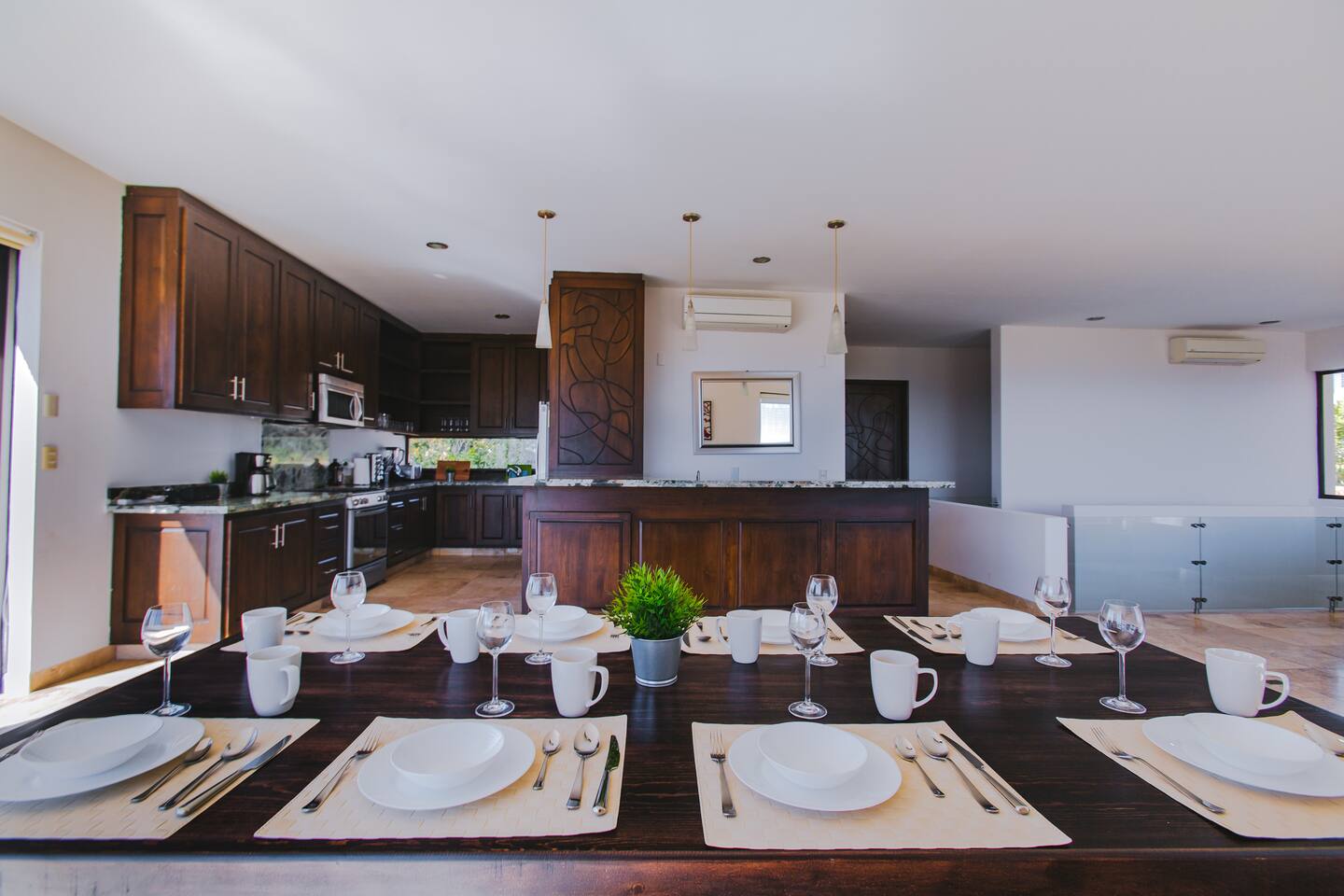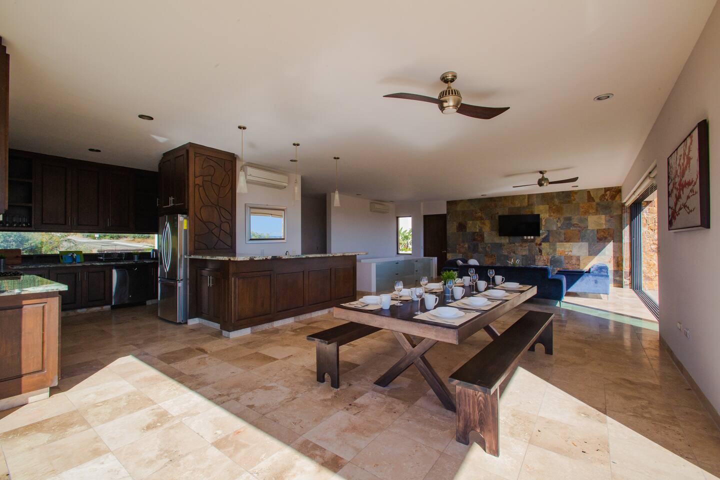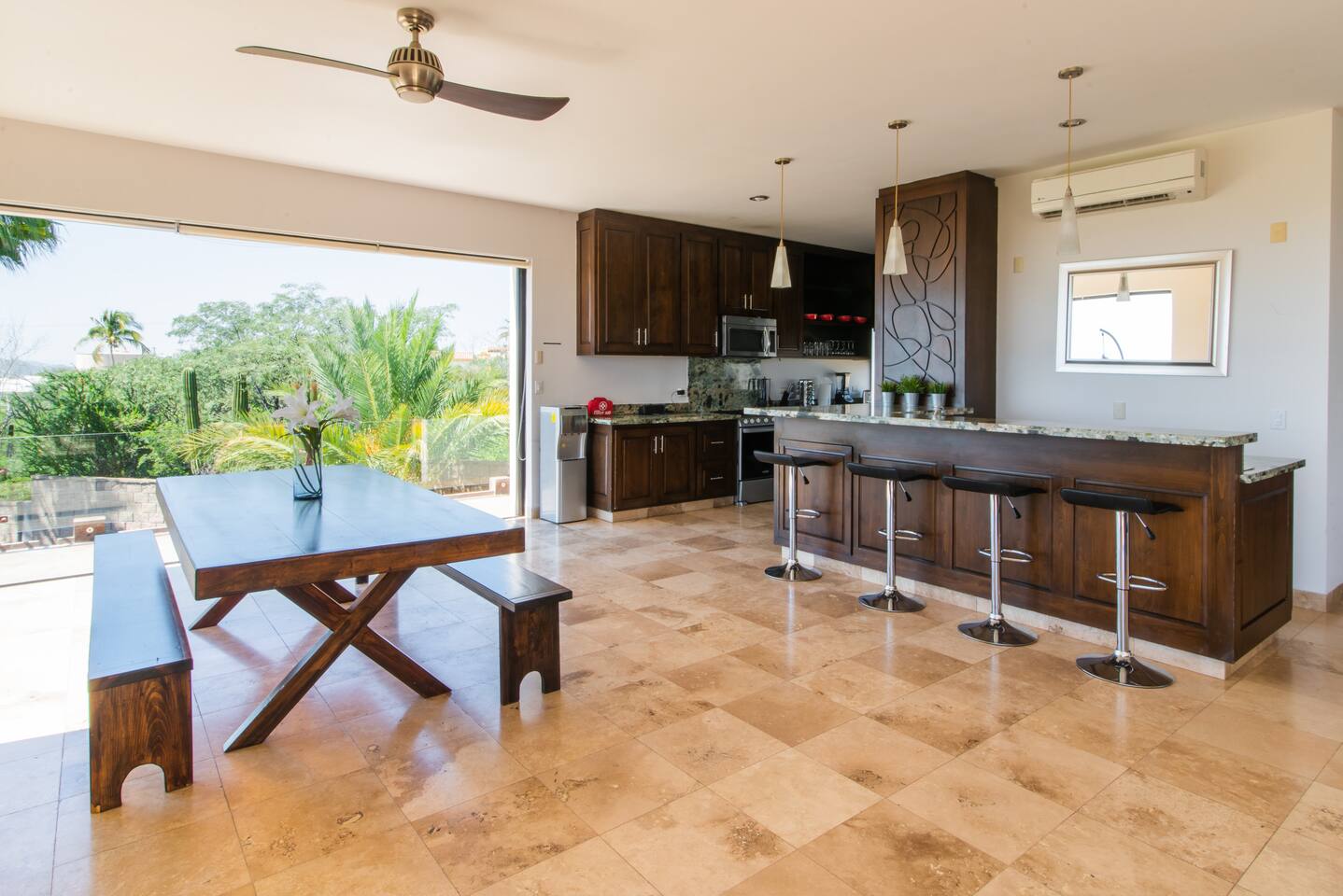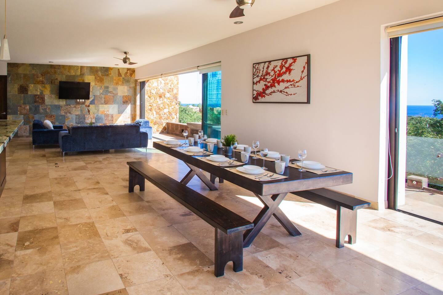 Our home was designed with beautiful indoor/outdoor living in mind and furnished to accommodate large groups comfortably. We border a large green area with native and tropical vegetation and are the closest house to the Ocean in our neighborhood. The pool and outdoor dining areas are extremely private which makes time with friends even more special. The dining table easily seats 12 and the outdoor patio table seats another 12. We have seen guests bring the outdoor table inside for larger groups to all eat together.